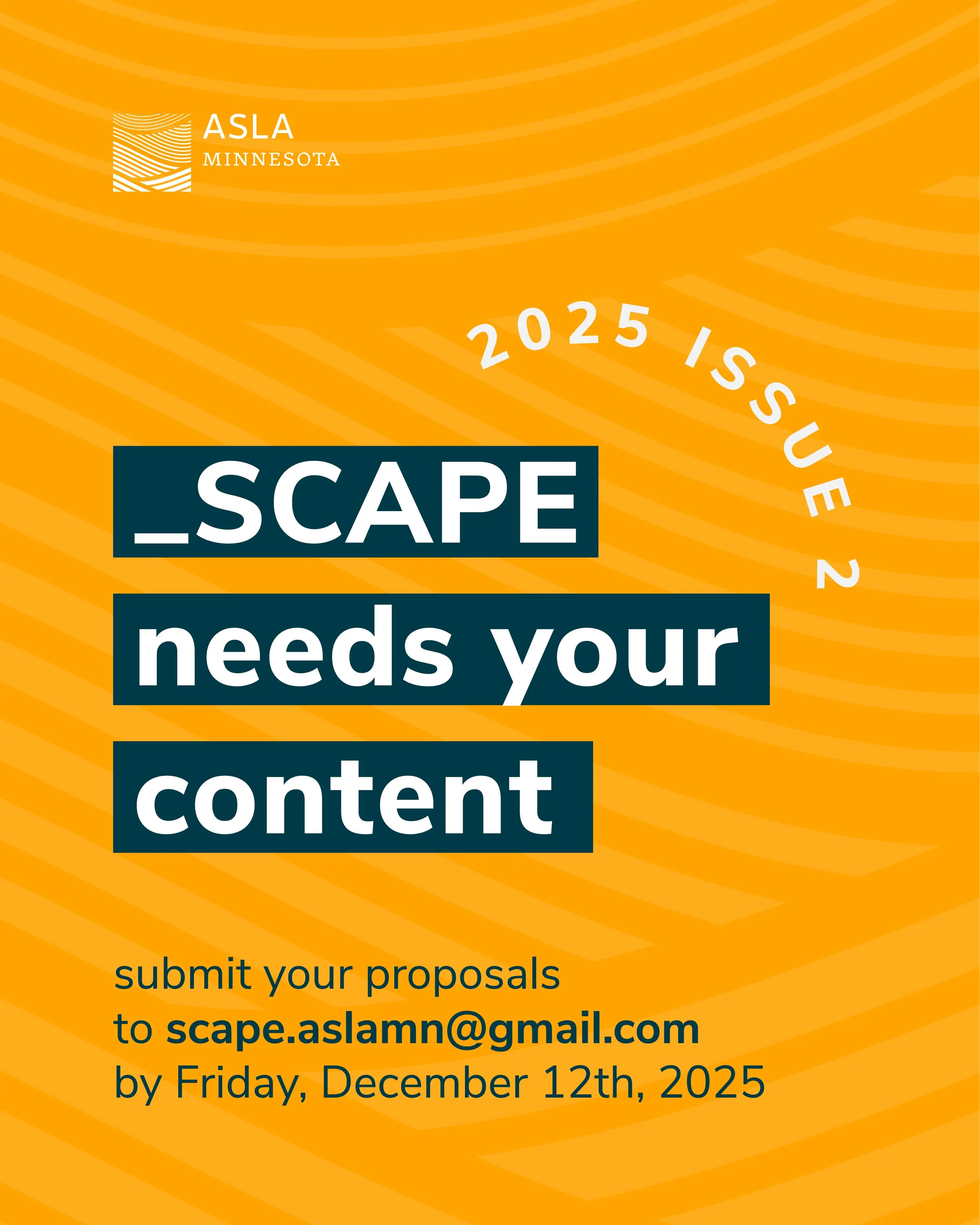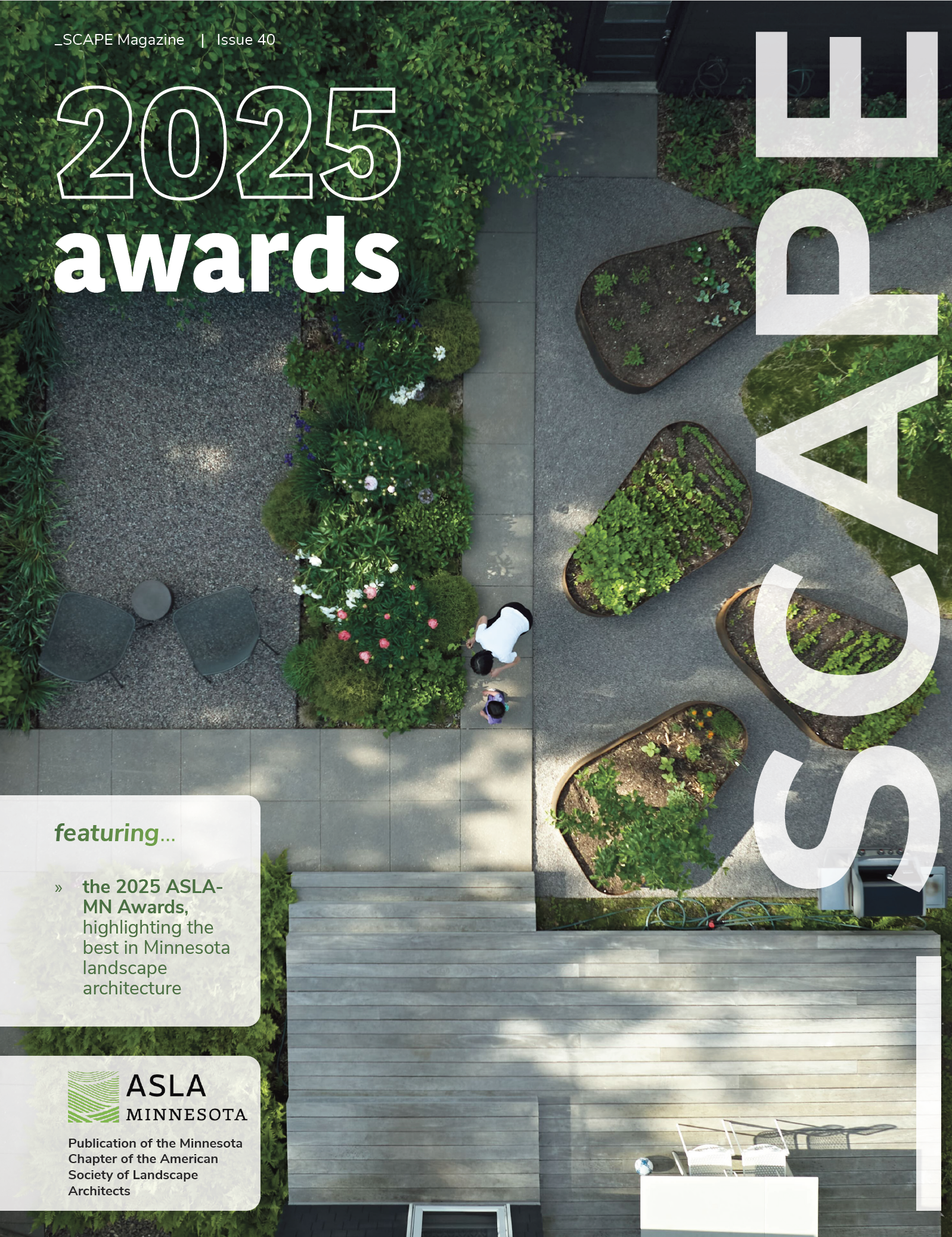 Established in 2003, _SCAPE magazine is a regionally recognized publication produced by the American Society of Landscape Architects, Minnesota Chapter (ASLA-MN). Since its launch, _SCAPE has evolved to become a valuable publication made available to ASLA-MN members in print and to the general public through an electronic version. _SCAPE serves as the chapters’ primary tool for communicating the nature and value of landscape architecture to broader audiences such as affiliated professionals, municipal administrators, policy makers and educators.